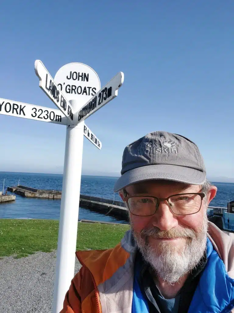 Guy reaching the finish line at John O’Groats!