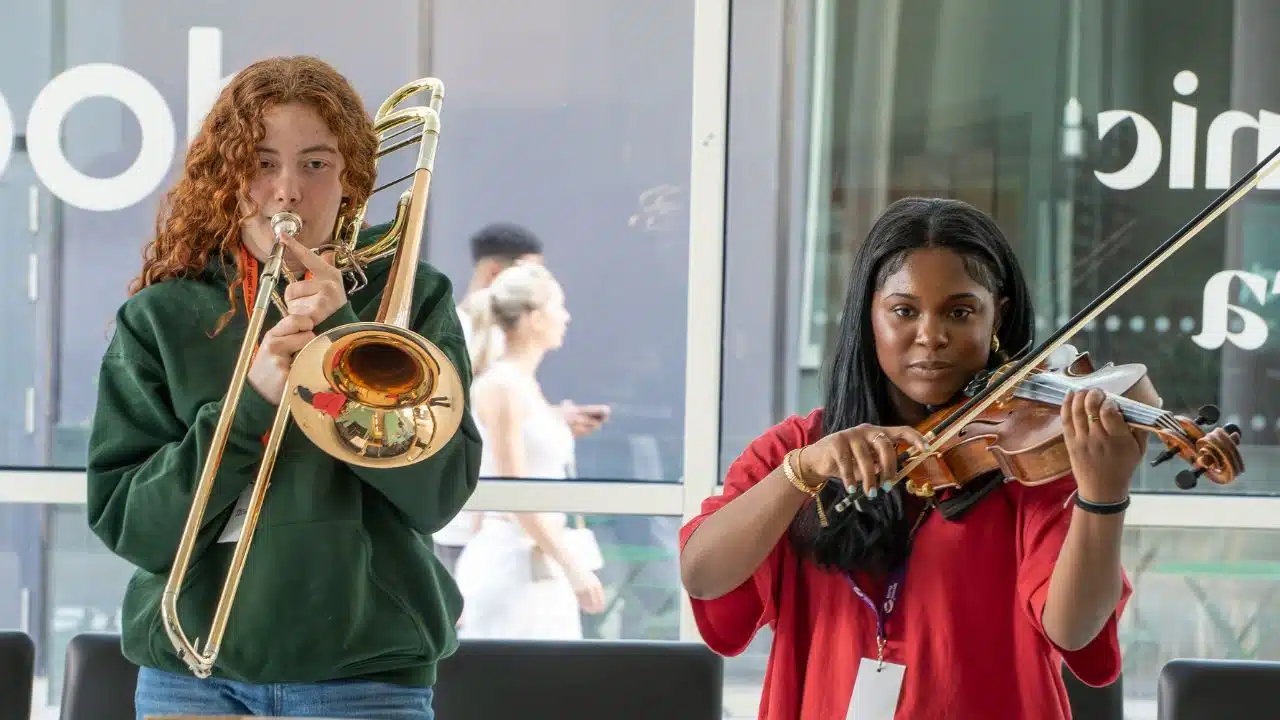 On Sunday 11 May 2025 we were delighted to welcome some of the advanced orchestral instrumentalists from our Thrive programme to the third Insight Day of our Exchange mentoring programme with the BBC Orchestras. This time, we were at Manchester’s iconic MediaCity!