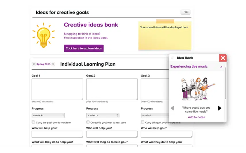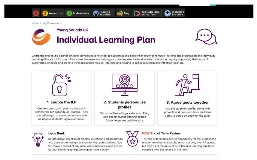 A refreshed homepage offers teachers guidance on how to get started with the ILP, along with direct links to any of their student ILP groups with one. It provides an overview of how the tool works and explains how using its Ideas Bank can support their students’ musical exploration.