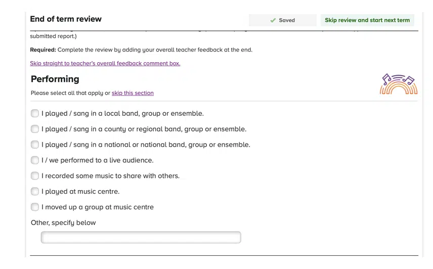The End-of-Term Review feature is integral to this upgrade. Teachers can complete a Review which records students’ progress against their ILP music goals and any other musical activities and learning they’ve participated in that term. It’s easy for them or their students to scroll back to check previous term reviews. Teachers can also carry goals forward and plan ahead for next term.